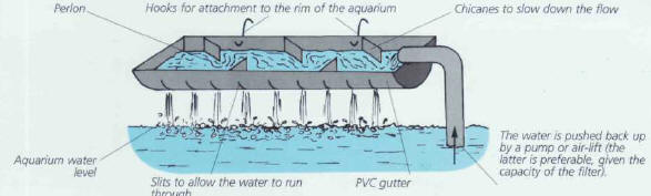 - Gutter filter: the water is pushed up from the aquarium by an electric pump